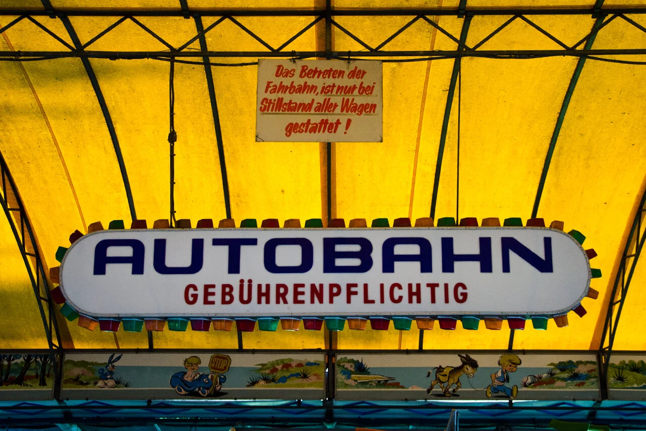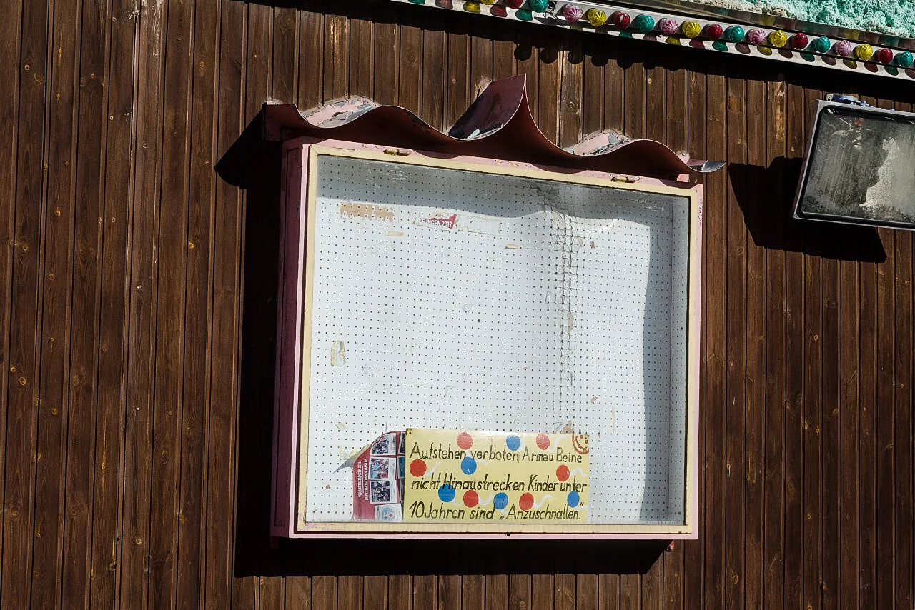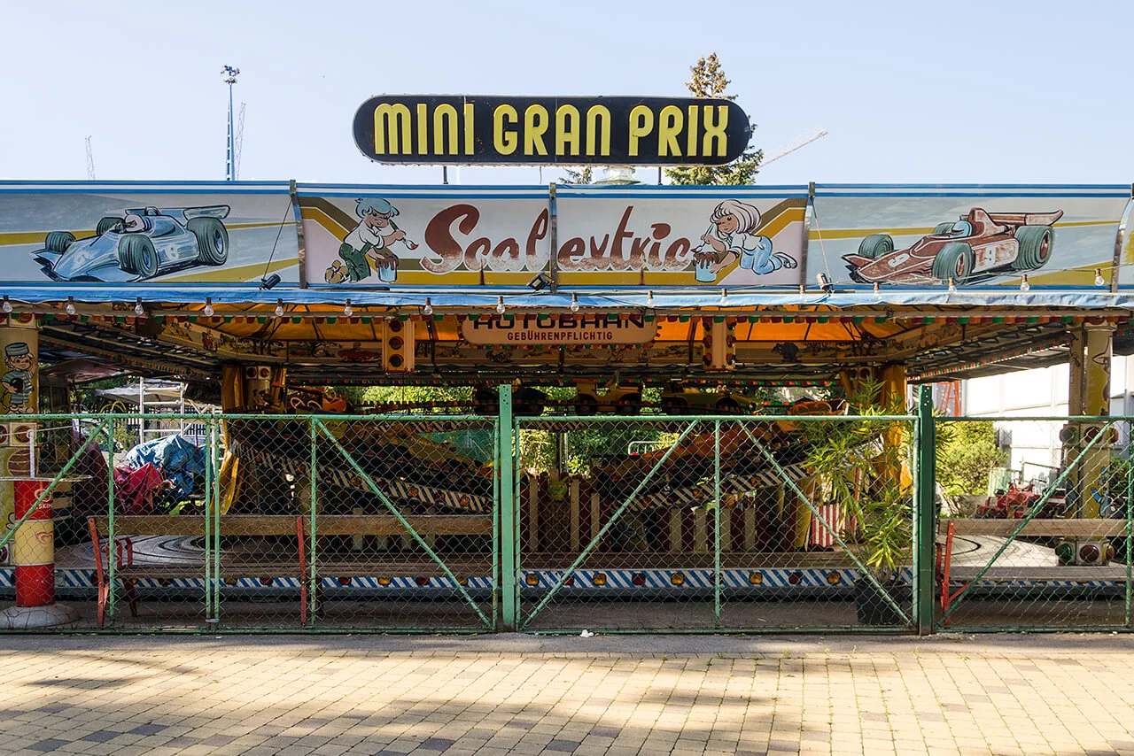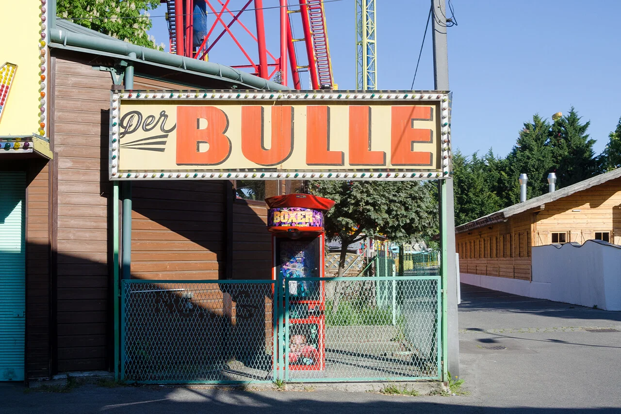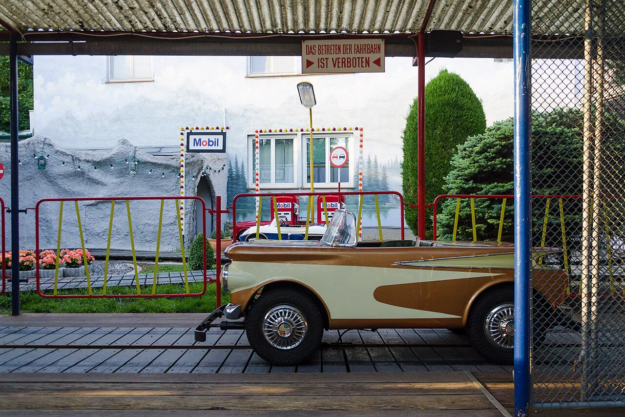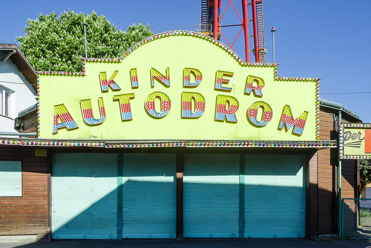 Alongside this continuity runs a rich layering of typographic fragments that recall the 1950s, when the Prater was rebuilt following its destruction in the final weeks of the war. Attractions for younger children, in particular, seem in no hurry to adapt to contemporary aesthetics: racing cars still bear the names of Formula One drivers whose careers ended in the 1980s, while fuel is dispensed beneath the emblem of a brand that disappeared from the market at the close of the last century.