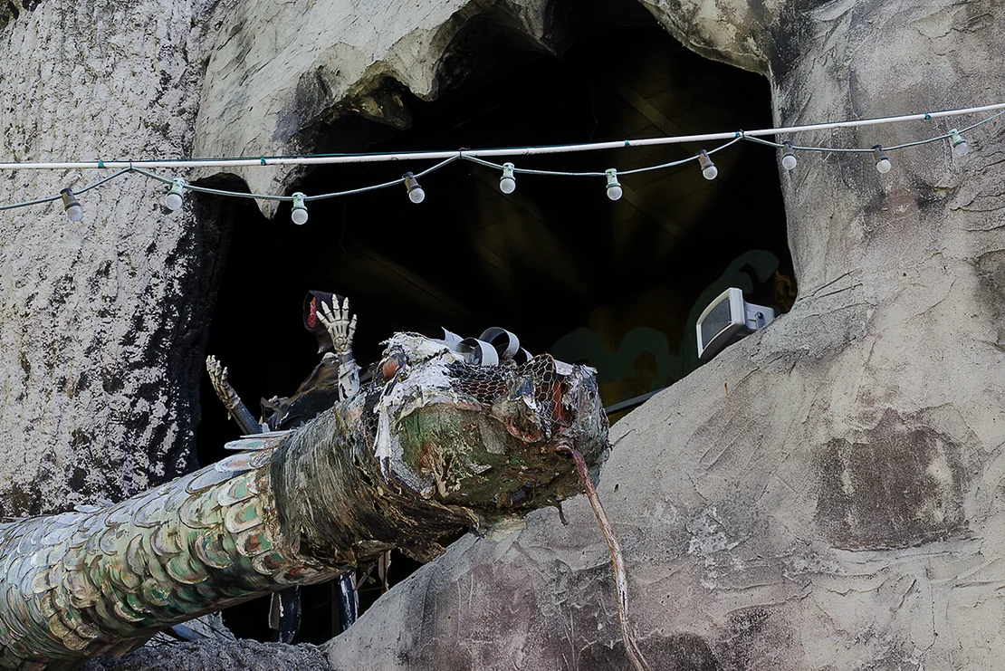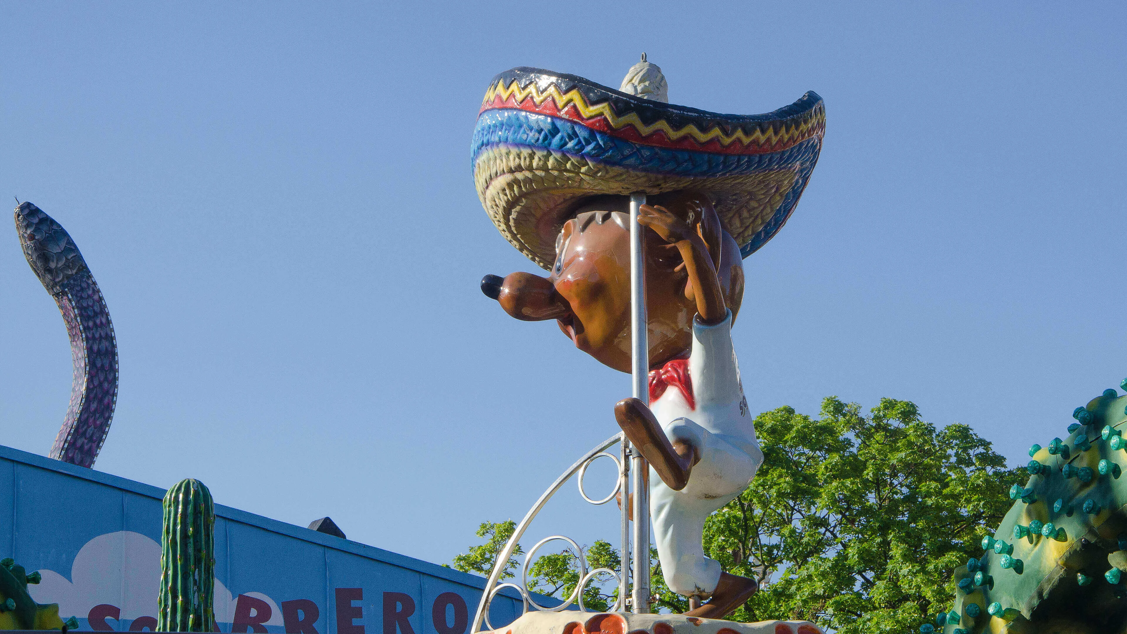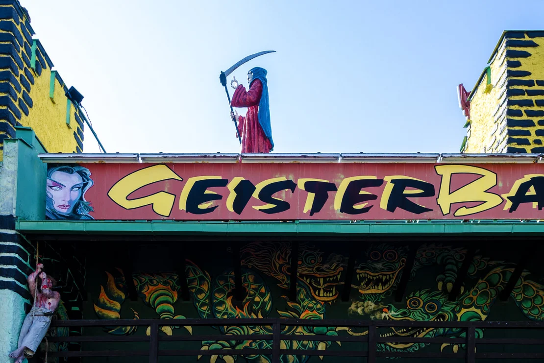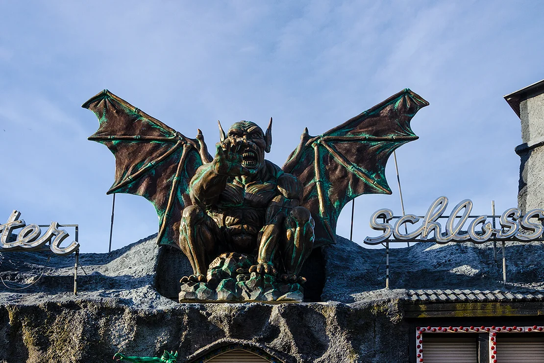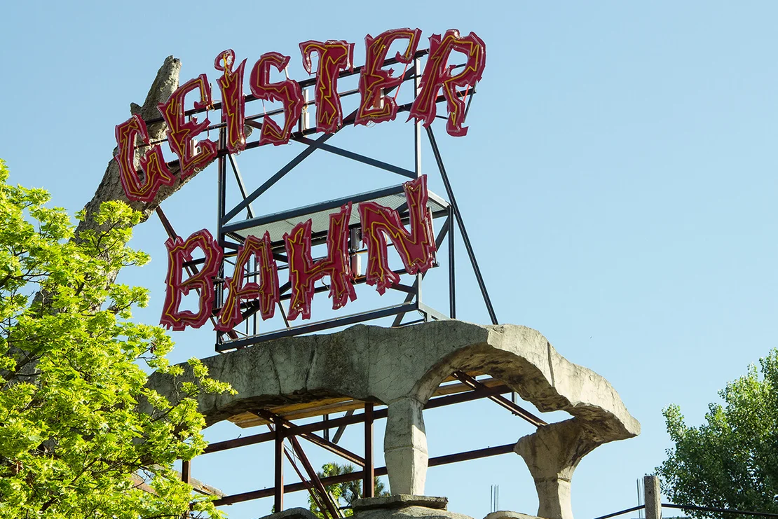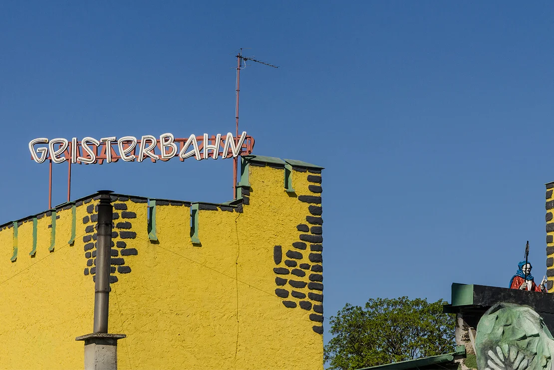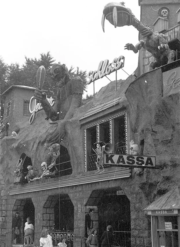 Today, it stands in a rather lamentable condition, its dragon figure hanging in tatters from the façade. The Grim Reaper atop the Geisterbahn zum Roten Adler has been circling above the roof since 1951. Until only a few years ago, the attraction offered a particularly unexpected thrill: concealed behind a bend, an attendant would lie in wait, tickling unsuspecting passengers with a feather duster.