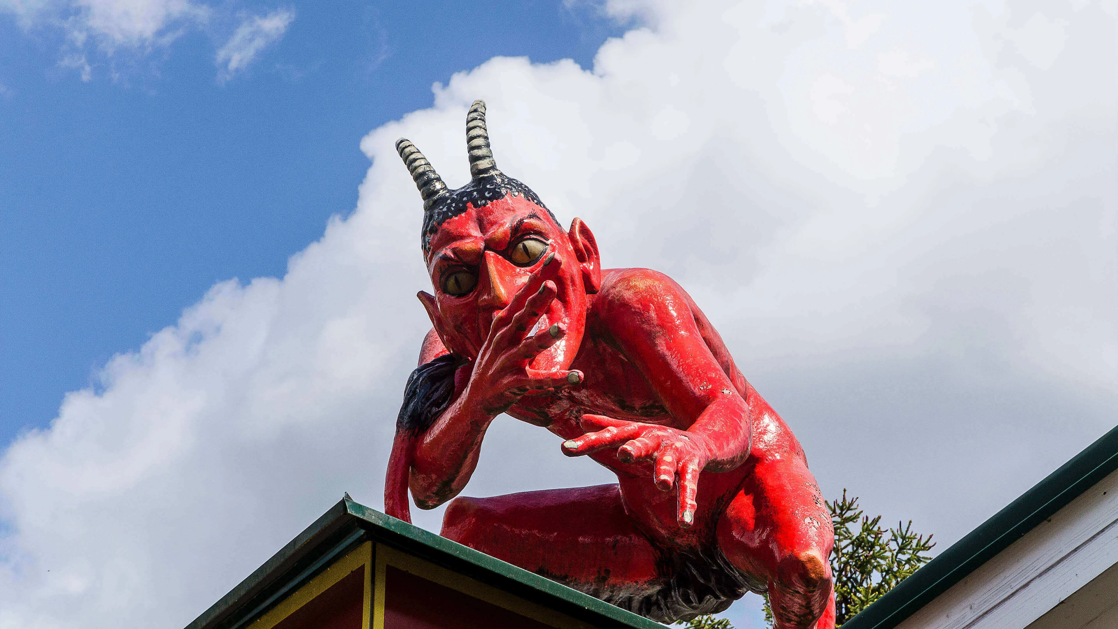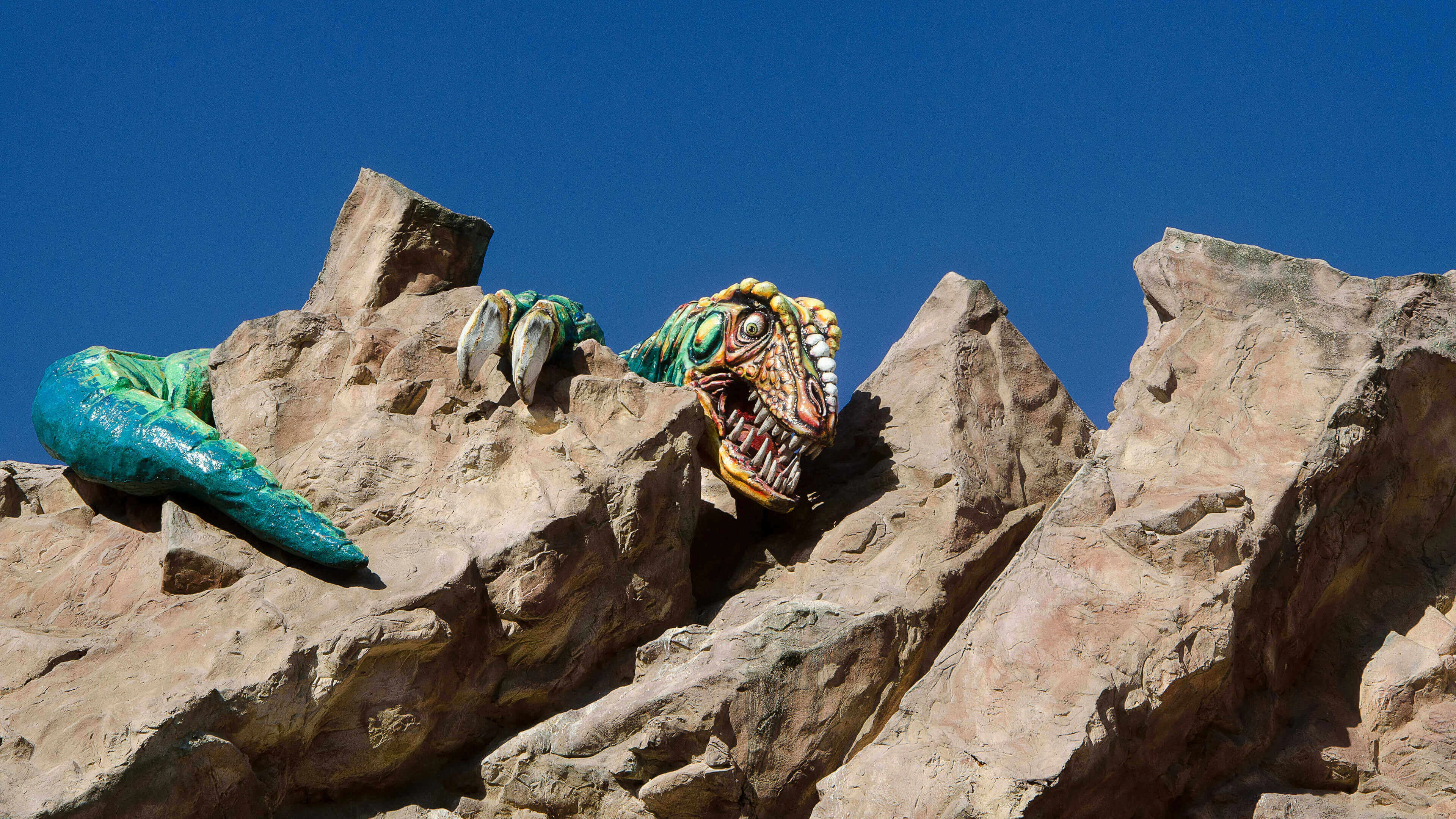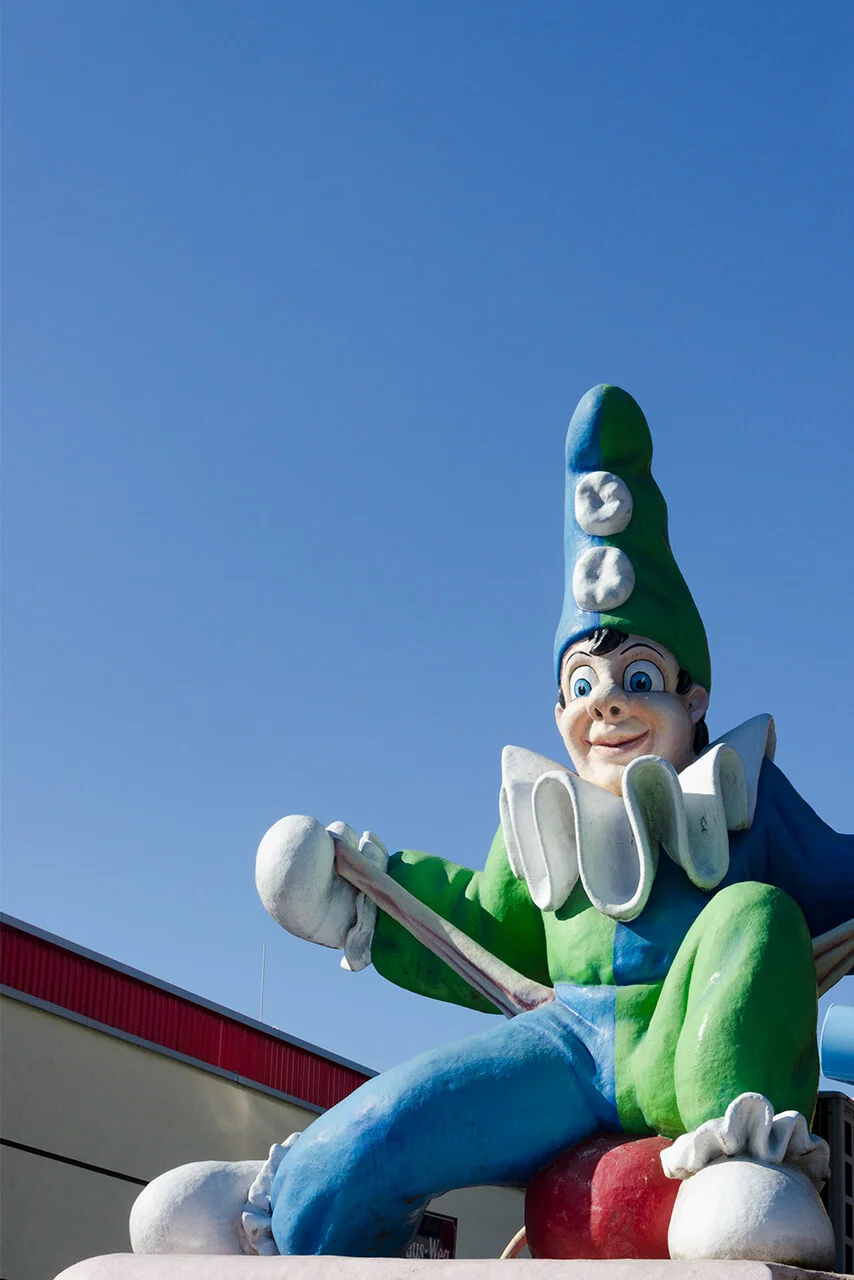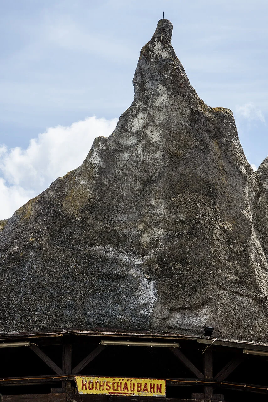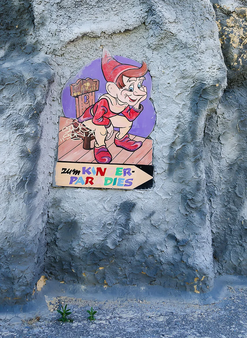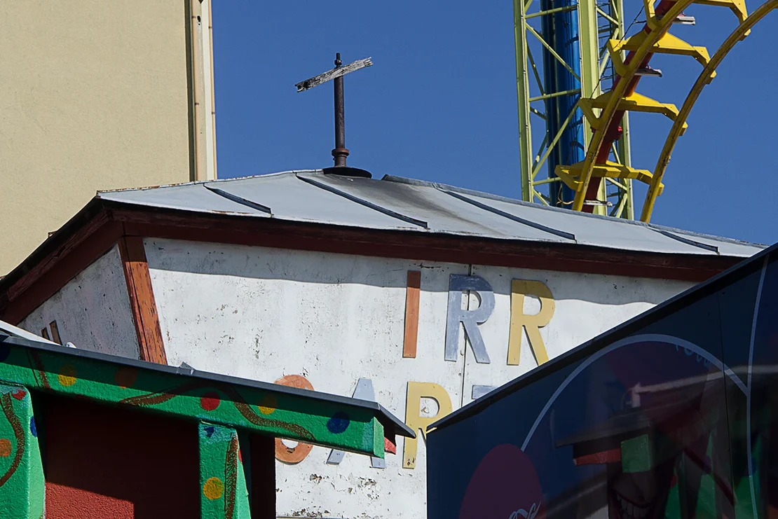 Today, it stands in a rather lamentable condition, its dragon figure hanging in tatters from the façade. The Grim Reaper atop the Geisterbahn zum Roten Adler has been circling above the roof since 1951. Until only a few years ago, the attraction offered a particularly unexpected thrill: concealed behind a bend, an attendant would lie in wait, tickling unsuspecting passengers with a feather duster.