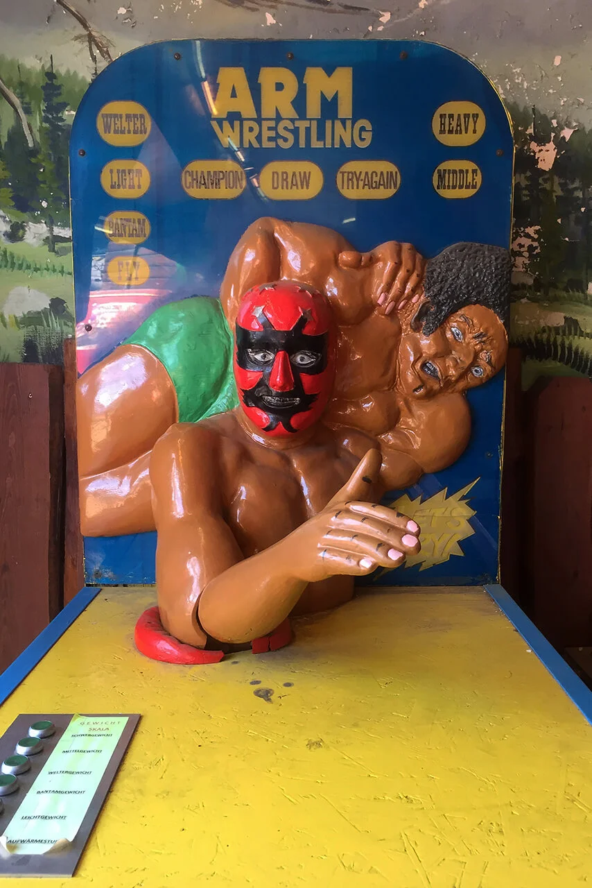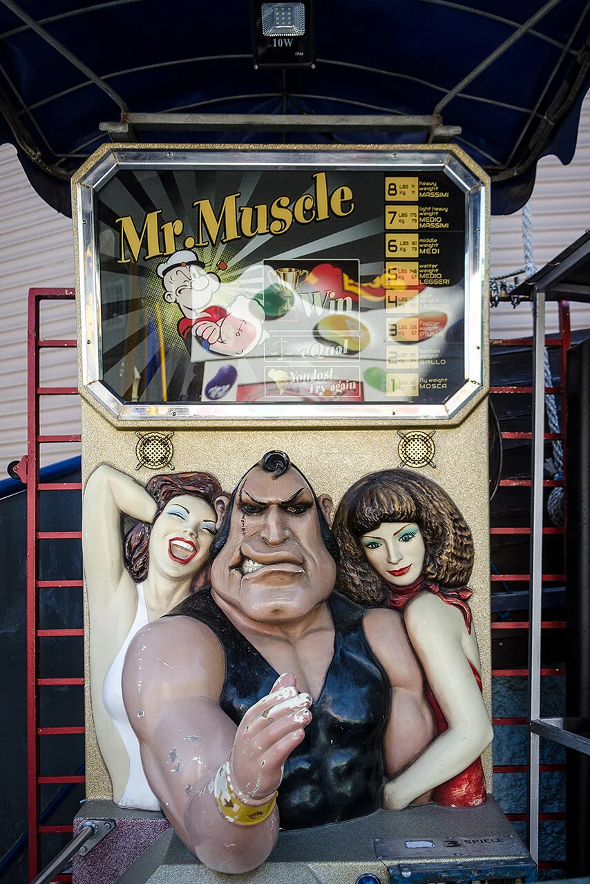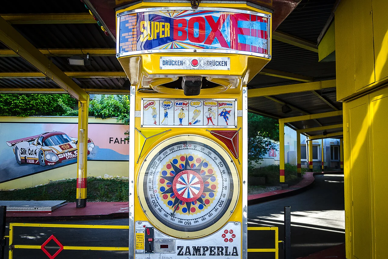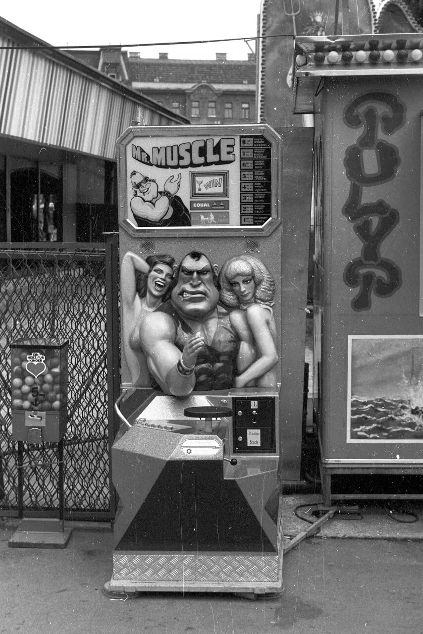 Traces of this period remain visible today in the numerous strength-testing machines—a long-standing Prater tradition, popularised by the iconic Watschenmann. While Mr. Muscle has undergone a somewhat incongruous visual overhaul, the machines produced by Zamperla continue to operate largely unchanged. The model shown below, incidentally, can also be found in the Kaeson Youth Park in North Korea.