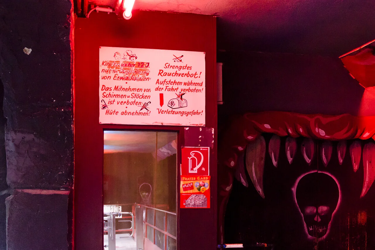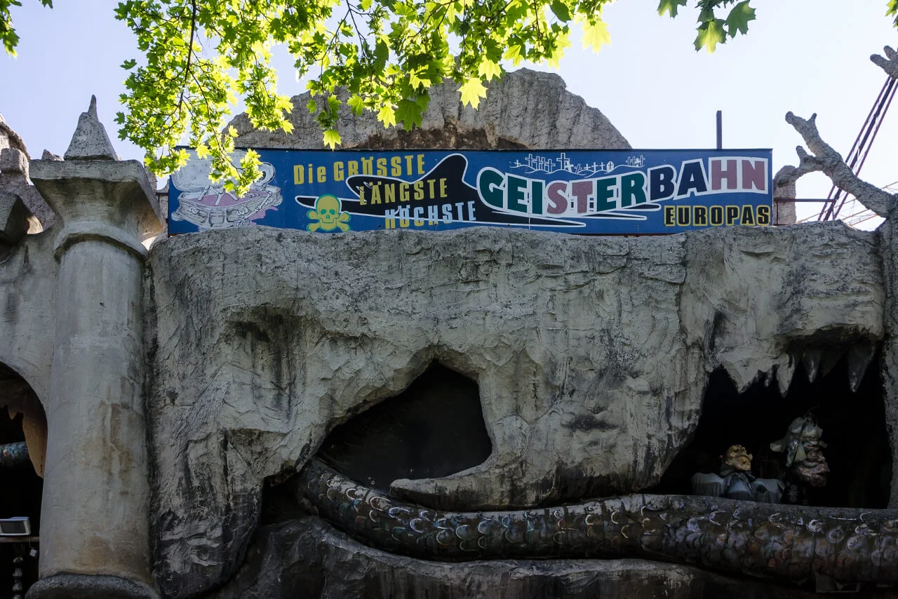 The Geisterschloss, constructed as early as 1948, is the oldest ghost train in the Prater. While its striking animatronics have been replaced over time, the original neon signage from 1955 has been preserved. By contrast, the Große Geisterbahn once boasted of being the largest, longest, and tallest ghost train in Europe.