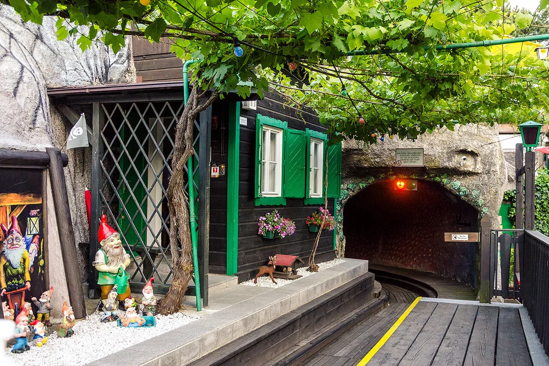 The Hochschaubahn, located beside the Schweizerhaus, is the oldest surviving elevated scenic railway in the world. Constructed from 1948 onwards and opened in 1950 as the Alpenbahn, it soon acquired its affectionate nickname, the Zwergerlbahn, from Viennese visitors—owing to the garden gnomes placed along its route.