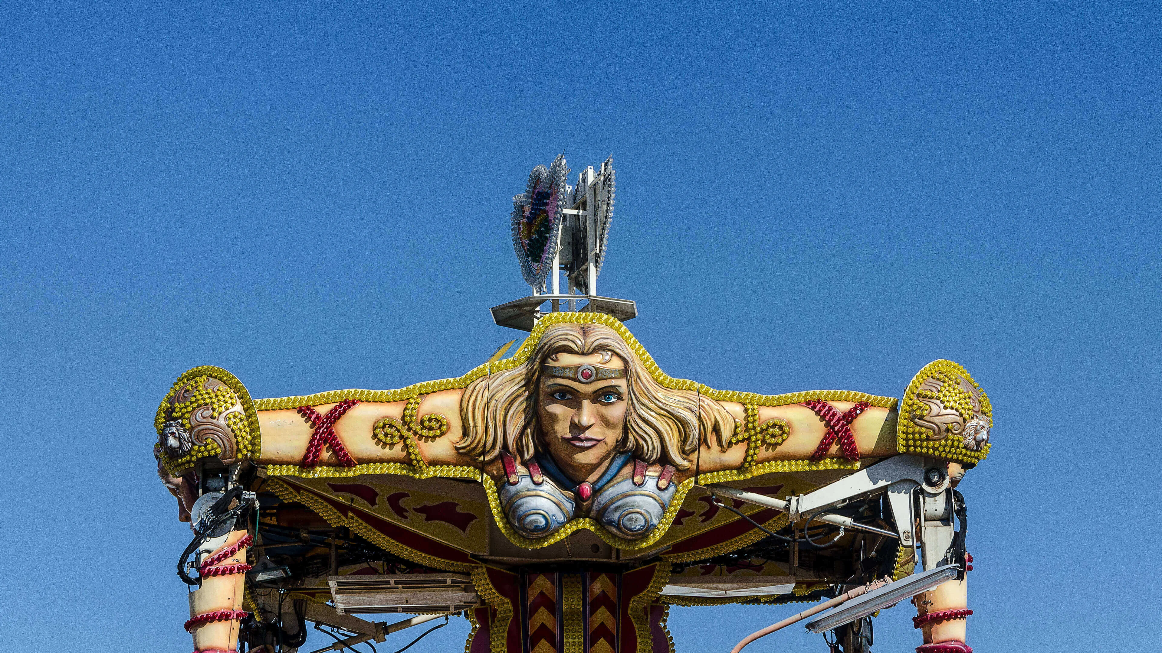 Where crowds would normally press together: emptiness. Where the cacophony of barkers’ calls and cheap Euro-disco would drown out every word: silence. In its place, something rarely heard here—the gentle clatter of breakfast dishes on a Sunday morning. For alongside the loud attractions, many of the showmen live directly beside or behind their rides.