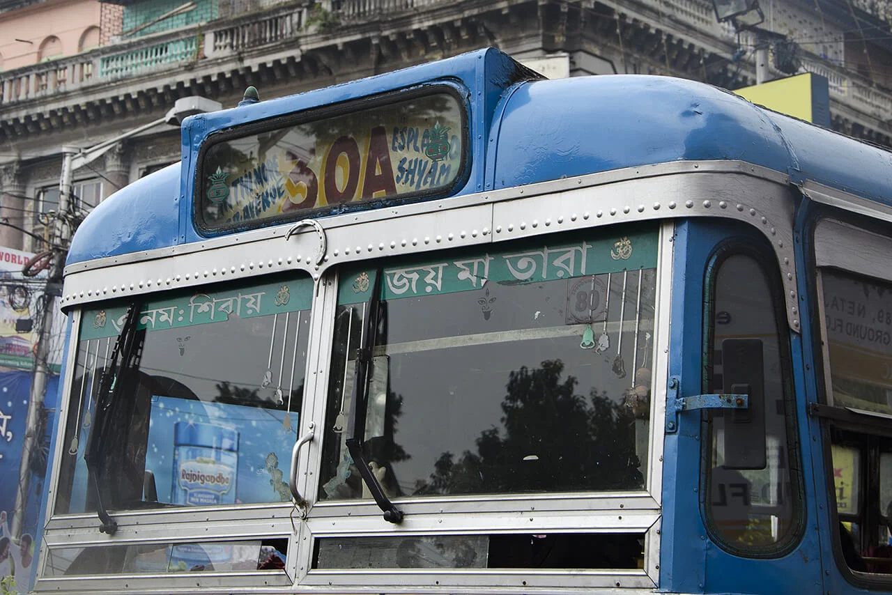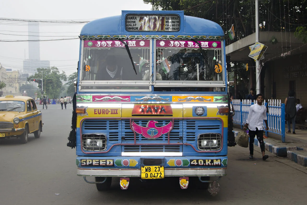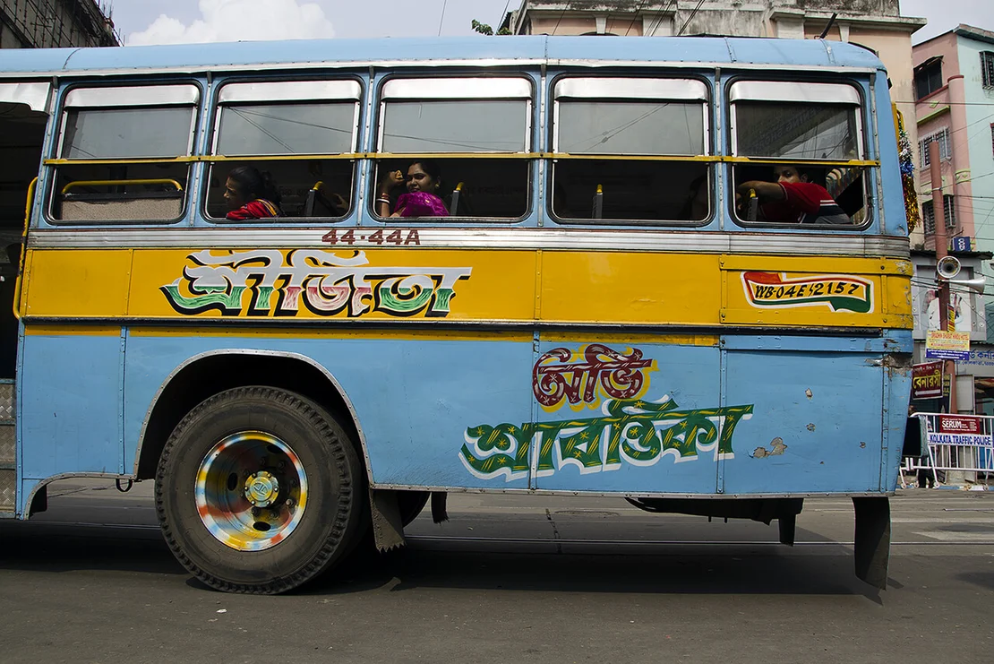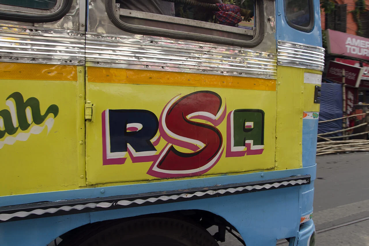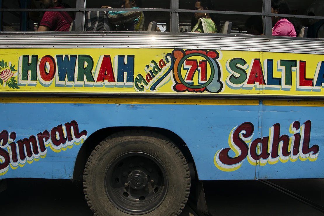 No two of these meticulously crafted inscriptions are alike. Each is hand-painted, frequently embellished with floral motifs or other decorative elements. These vivid and highly individual bus letterings are a distinctive feature of the city and contribute to the visual character of the so-called“City of Joy”.