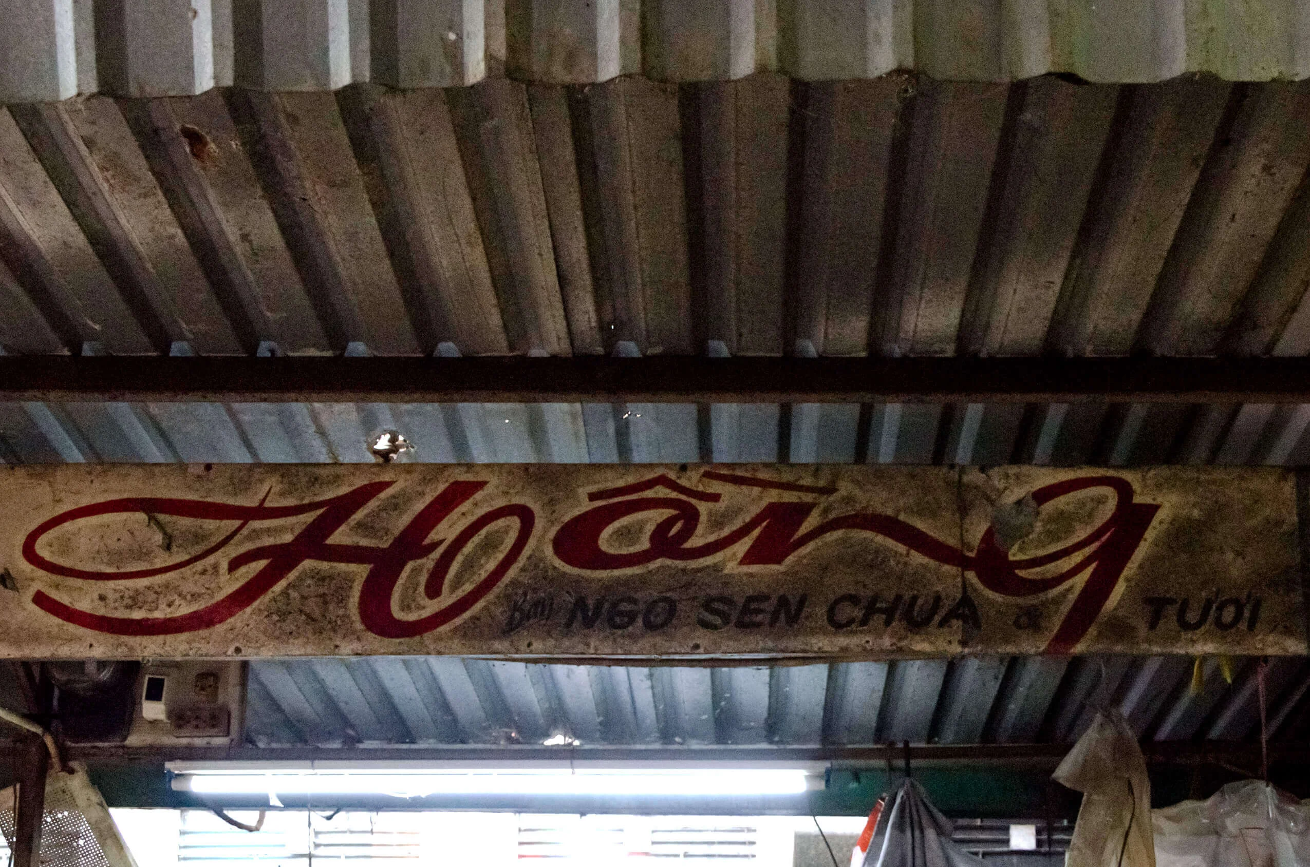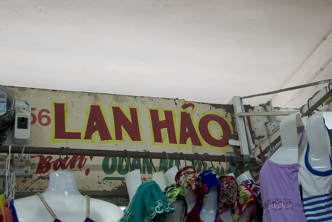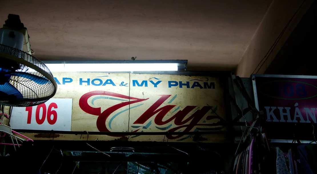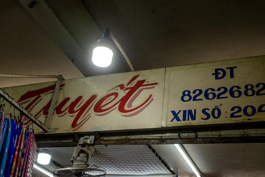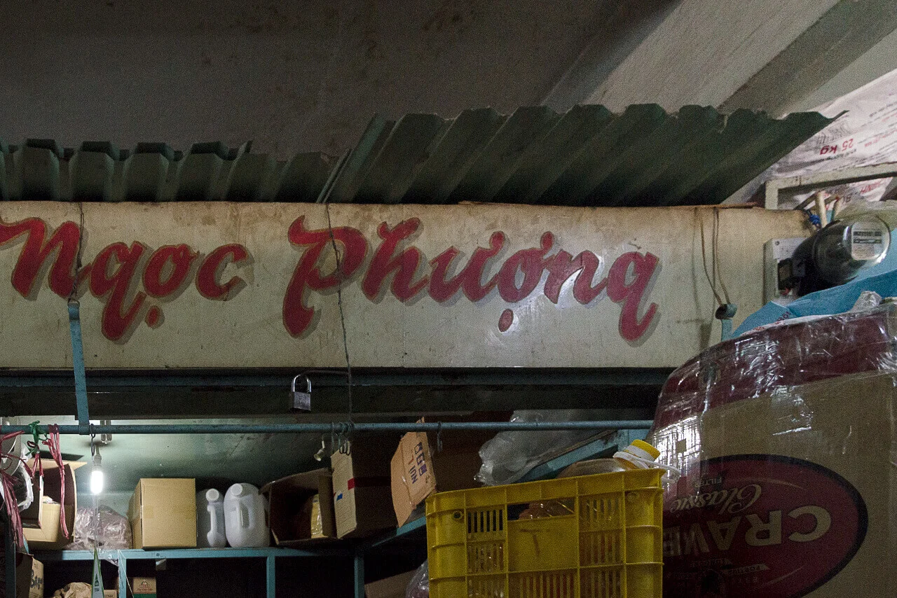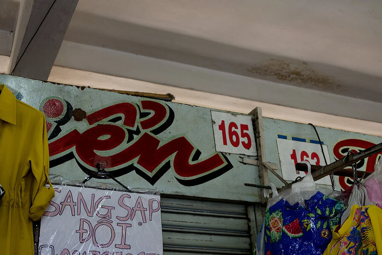Encounters with older signs proved considerably rarer. In the dim interiors of certain market halls, such as Xóm Chiếu Market, a few painted letterings can still be found. In some cases, however, the low light made it difficult to determine whether they were indeed hand-crafted. Occasionally, I came across examples on the streets as well—but the question remained: had I simply been looking in the wrong places?