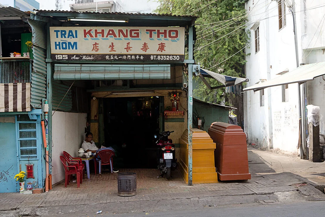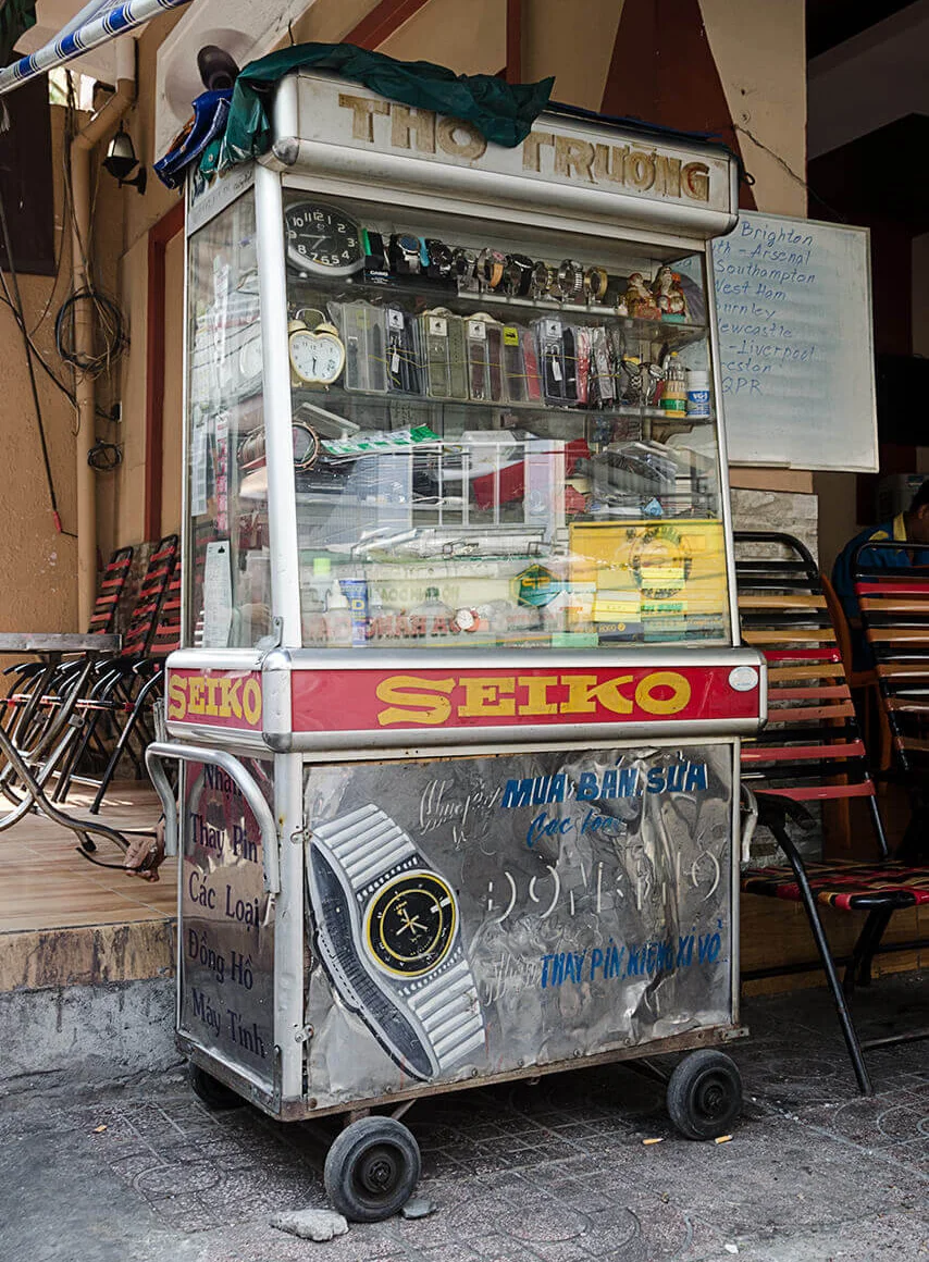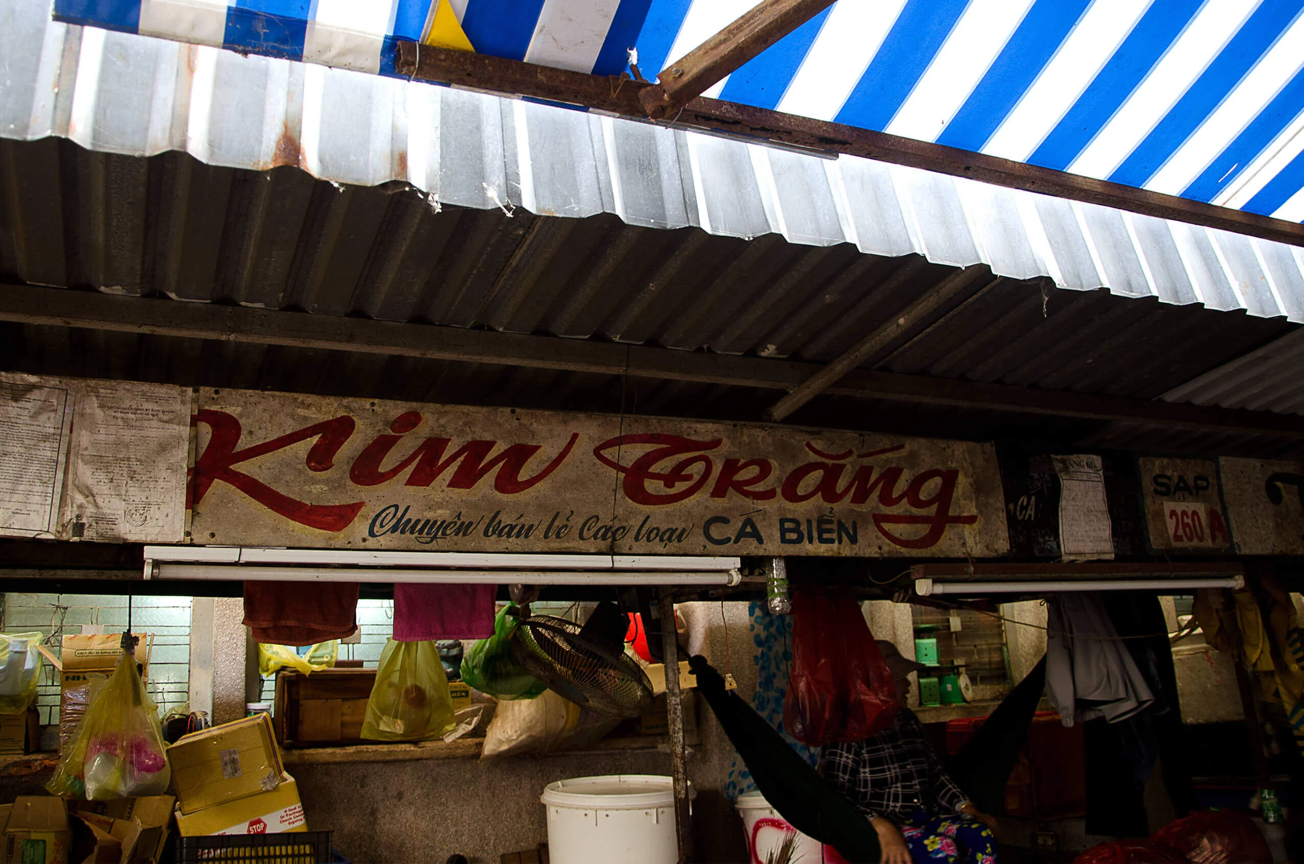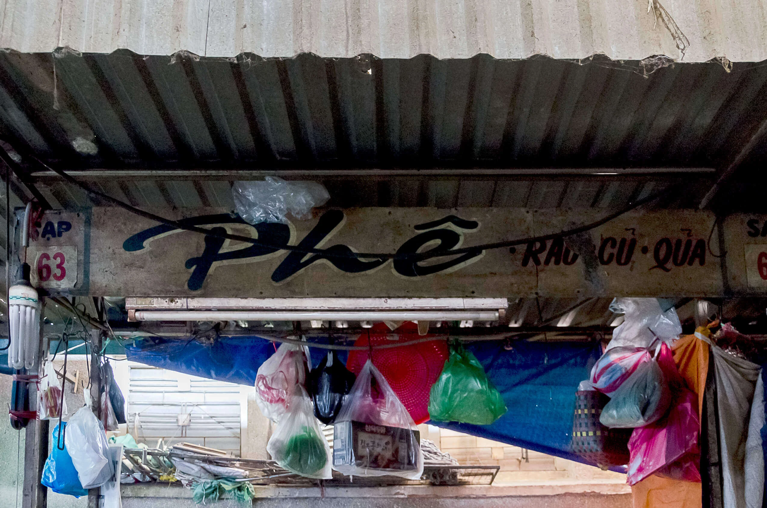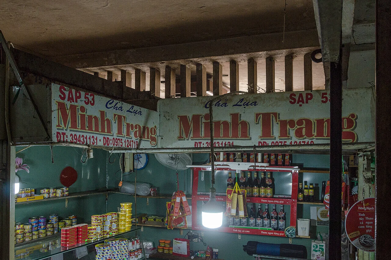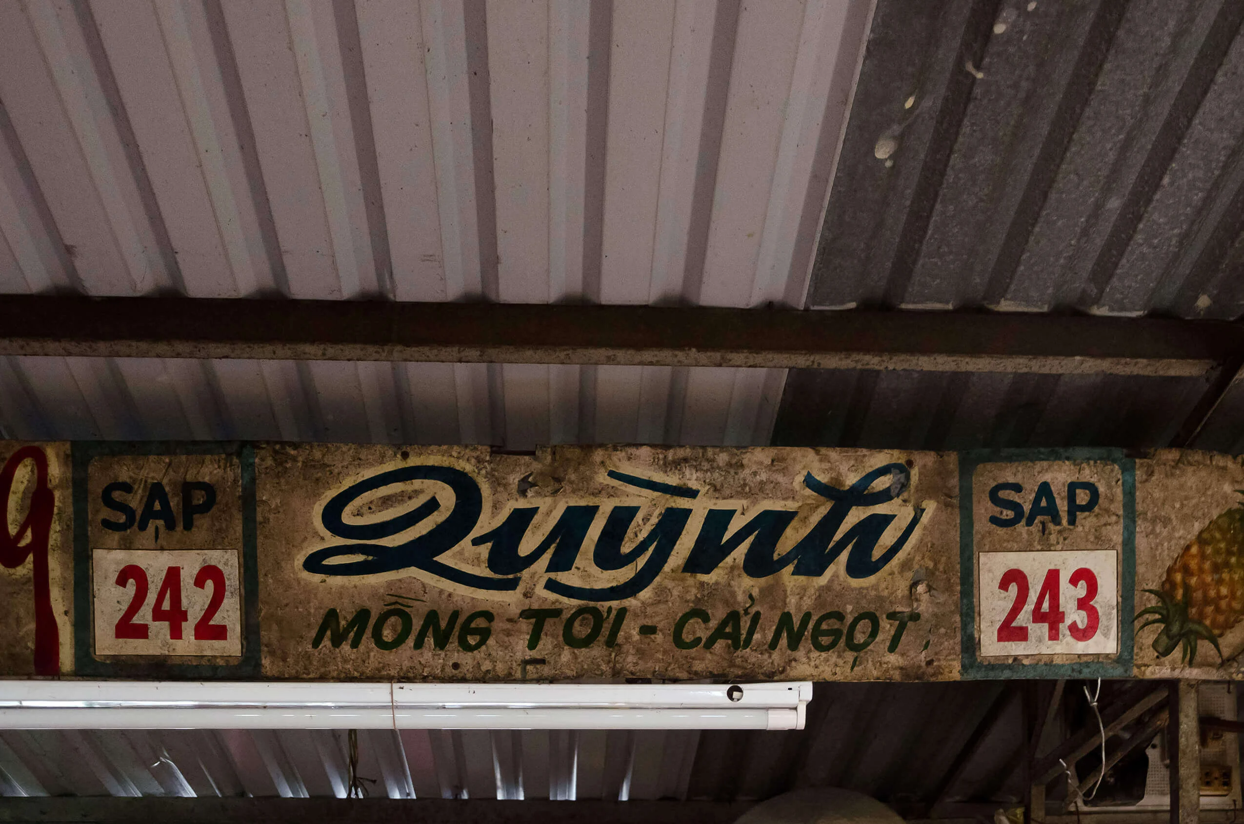 Encounters with older signs proved considerably rarer. In the dim interiors of certain market halls, such as Xóm Chiếu Market, a few painted letterings can still be found. In some cases, however, the low light made it difficult to determine whether they were indeed hand-crafted. Occasionally, I came across examples on the streets as well—but the question remained: had I simply been looking in the wrong places?