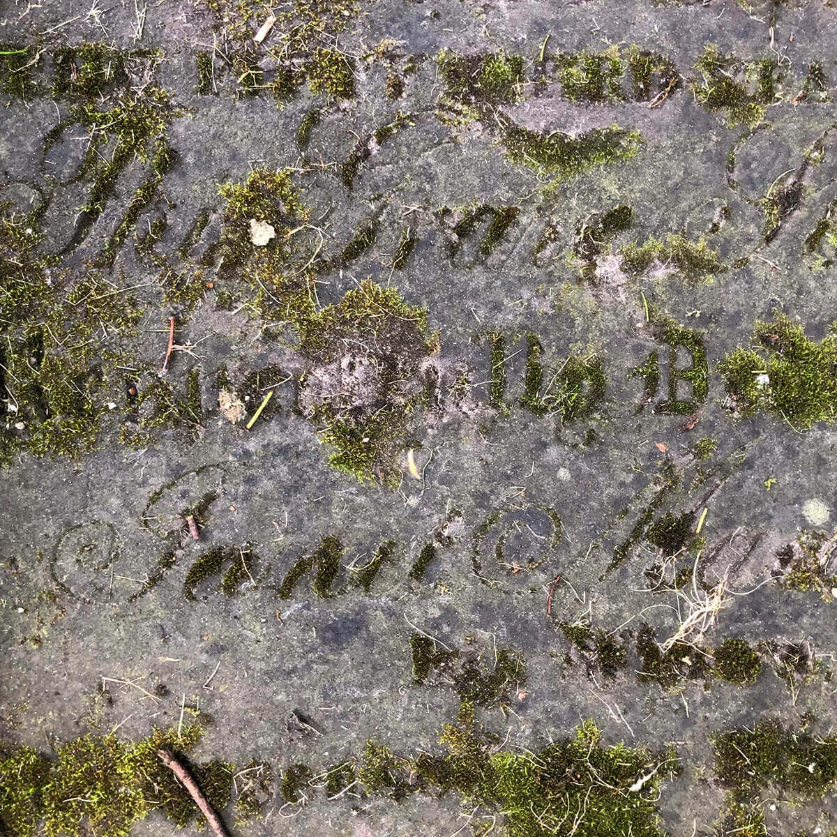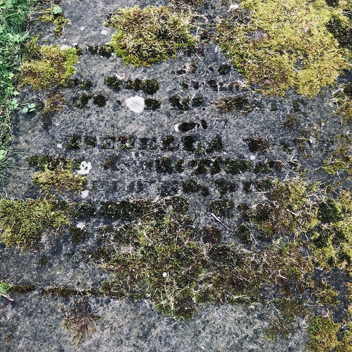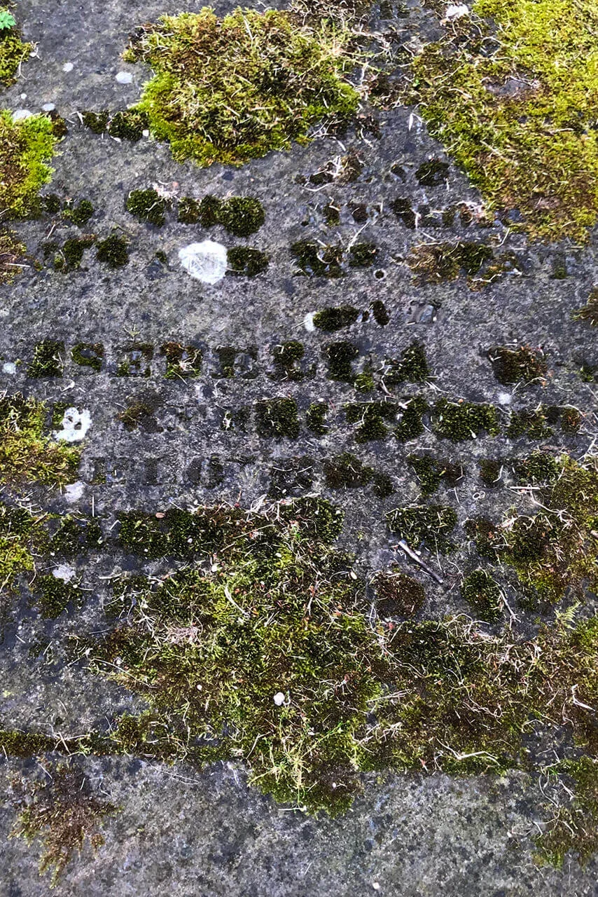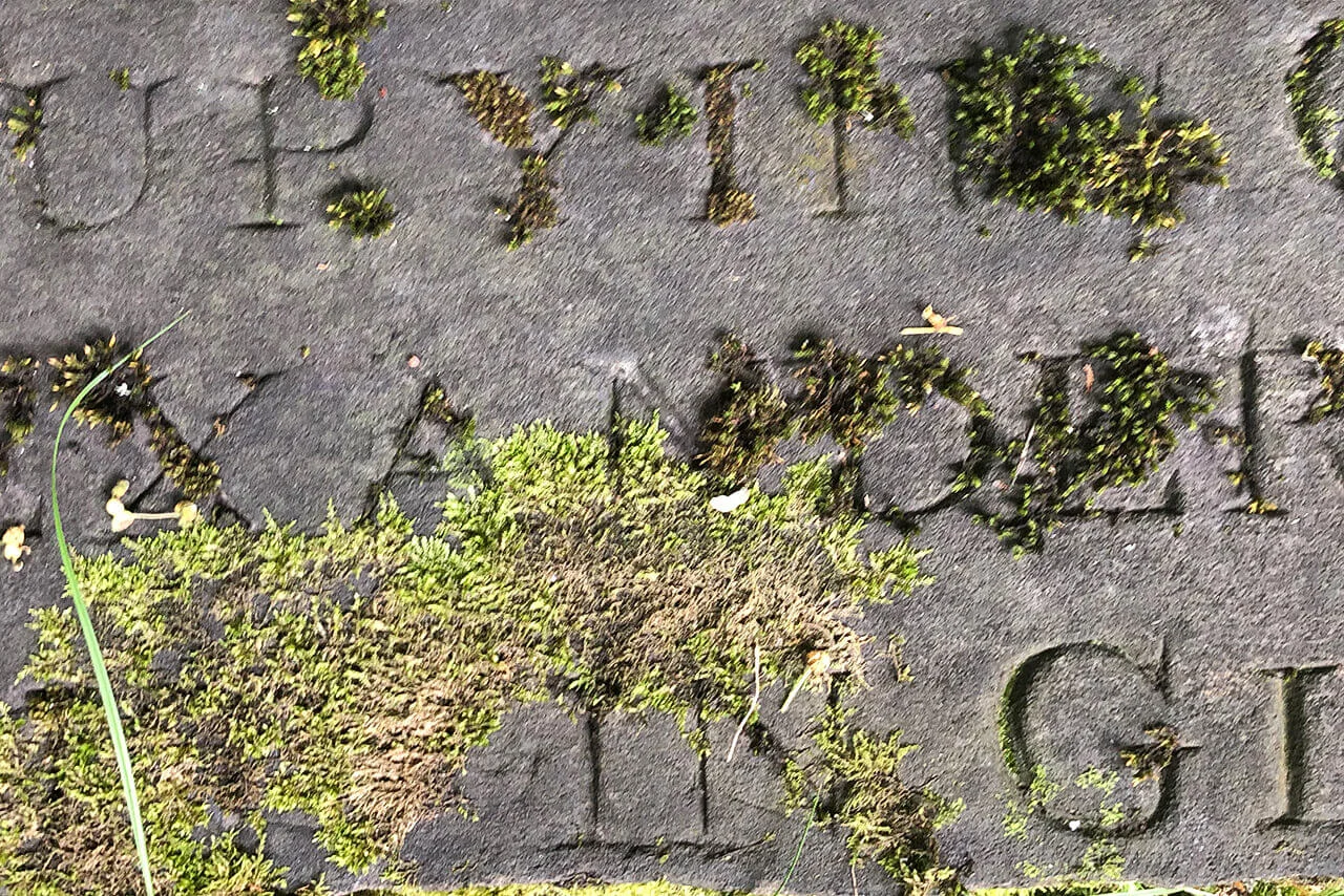 At Ramshorn Graveyard in Glasgow, an inverse phenomenon can be observed. Here, gravestones laid flat into the ground develop a distinctive typographic effect over time, as moss colonises the recessed lettering.