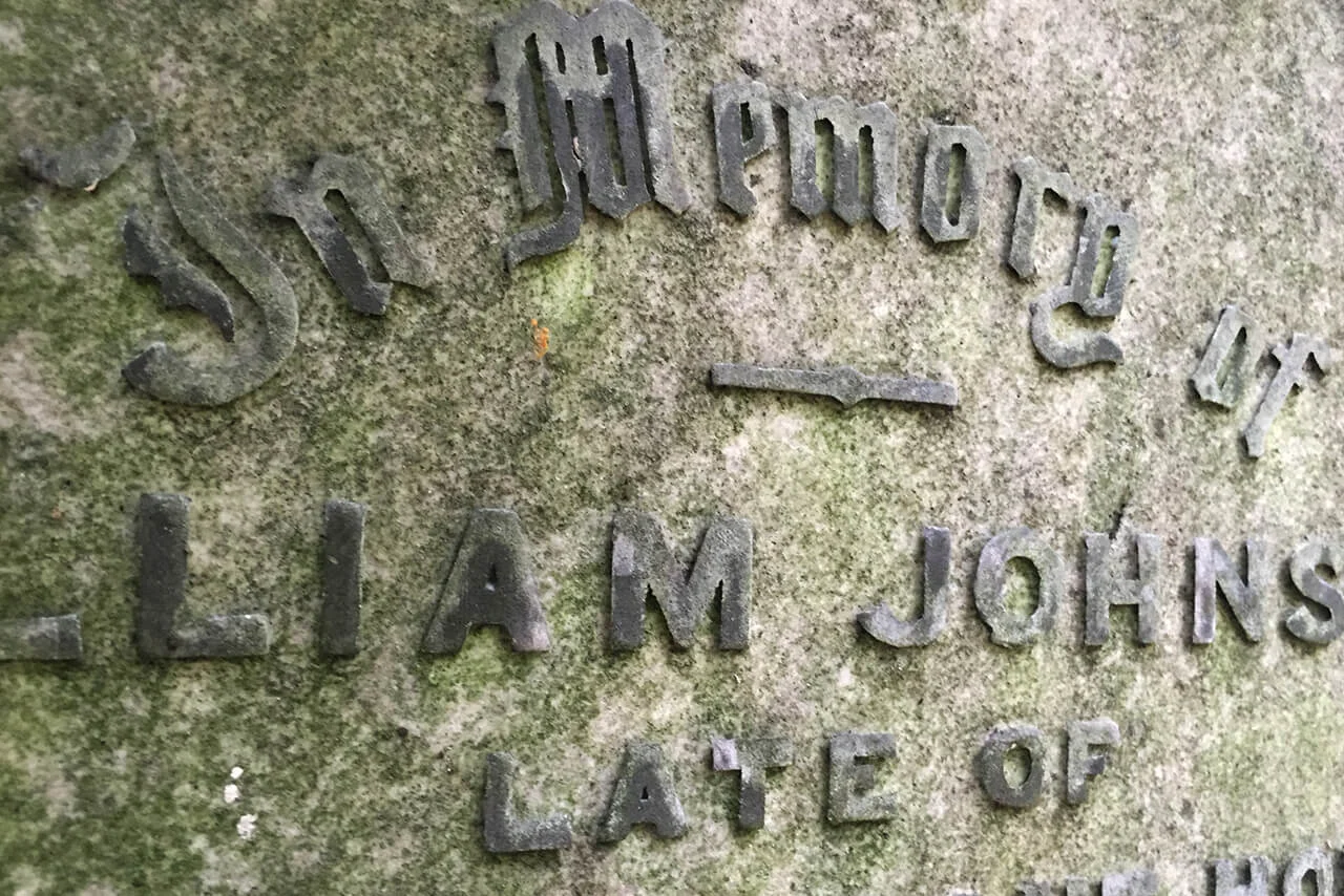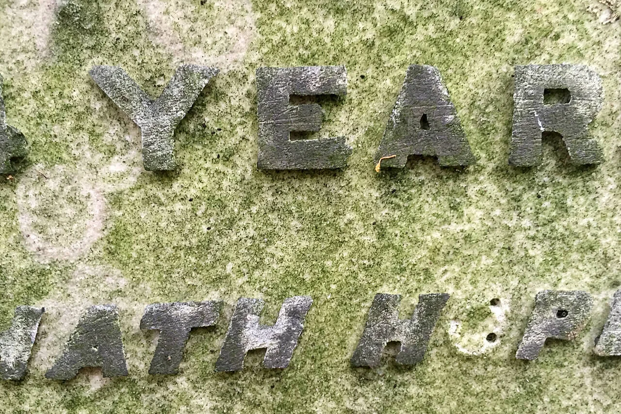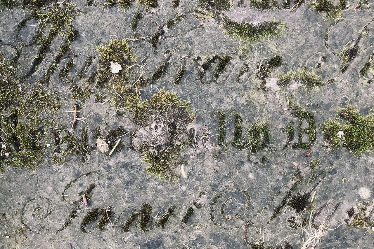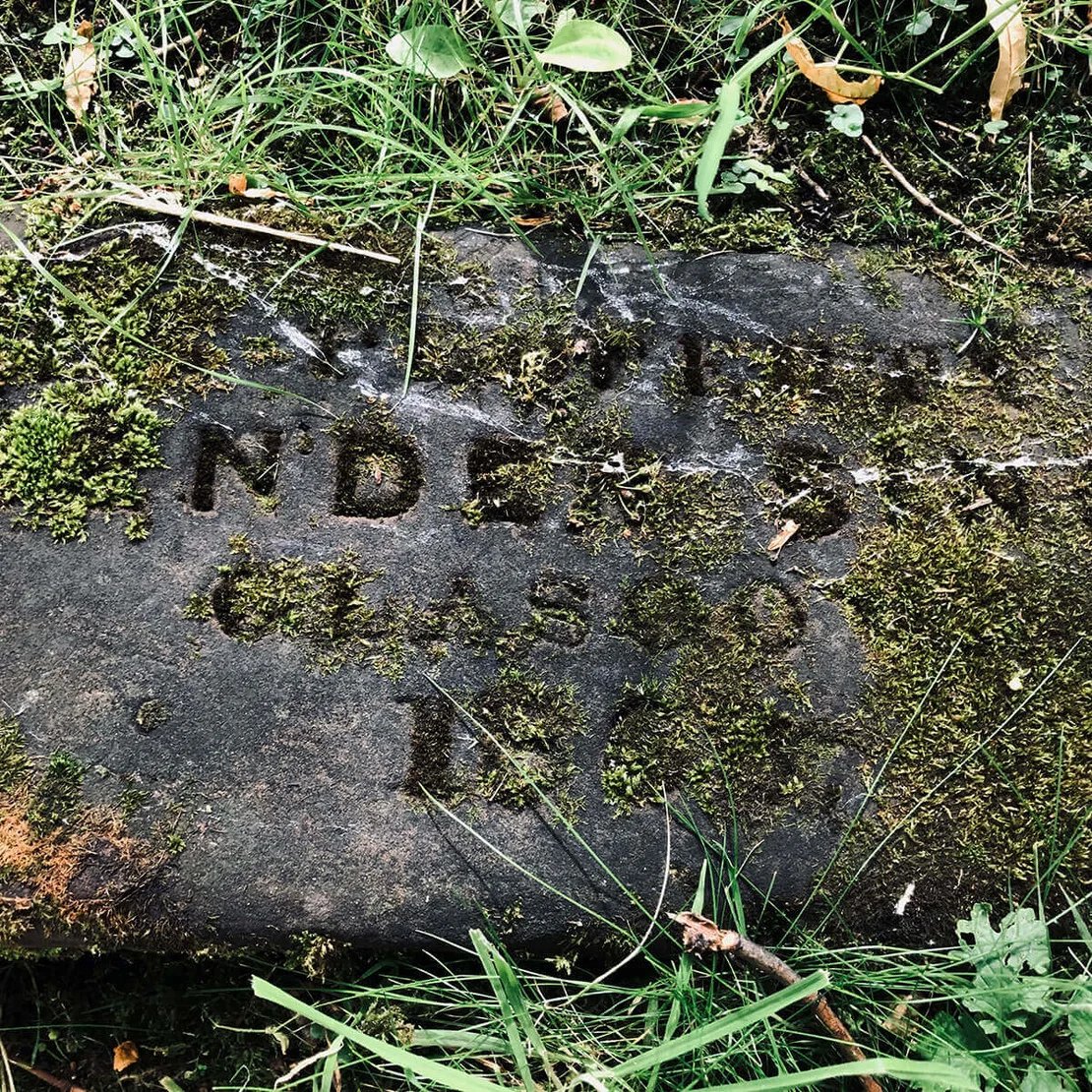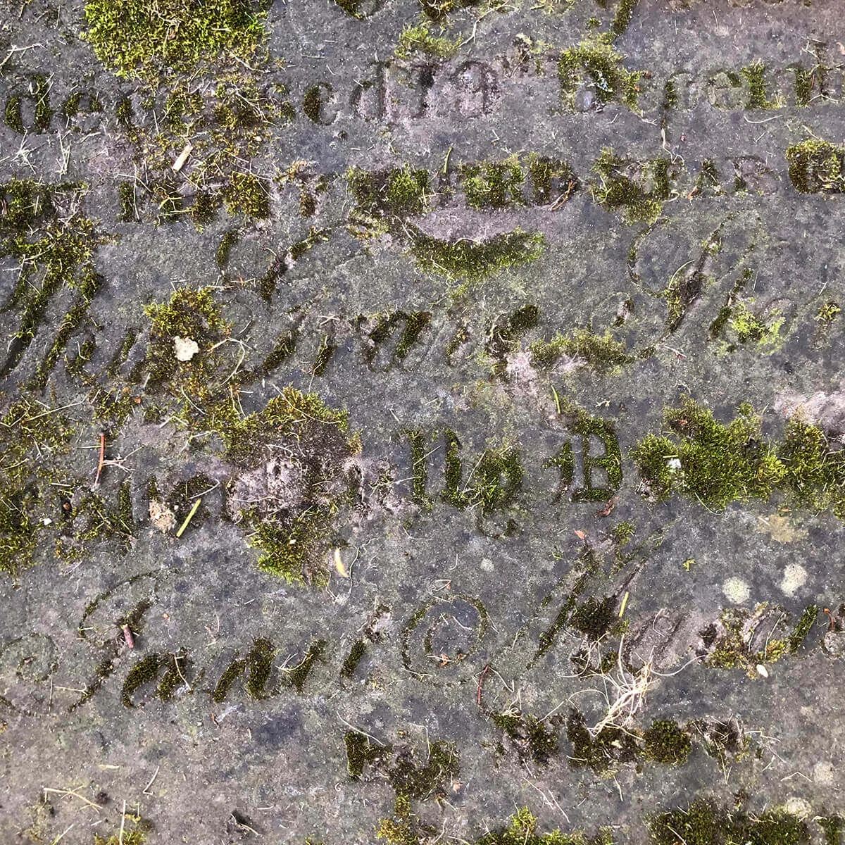 At Ramshorn Graveyard in Glasgow, an inverse phenomenon can be observed. Here, gravestones laid flat into the ground develop a distinctive typographic effect over time, as moss colonises the recessed lettering.