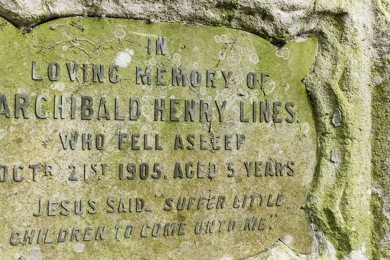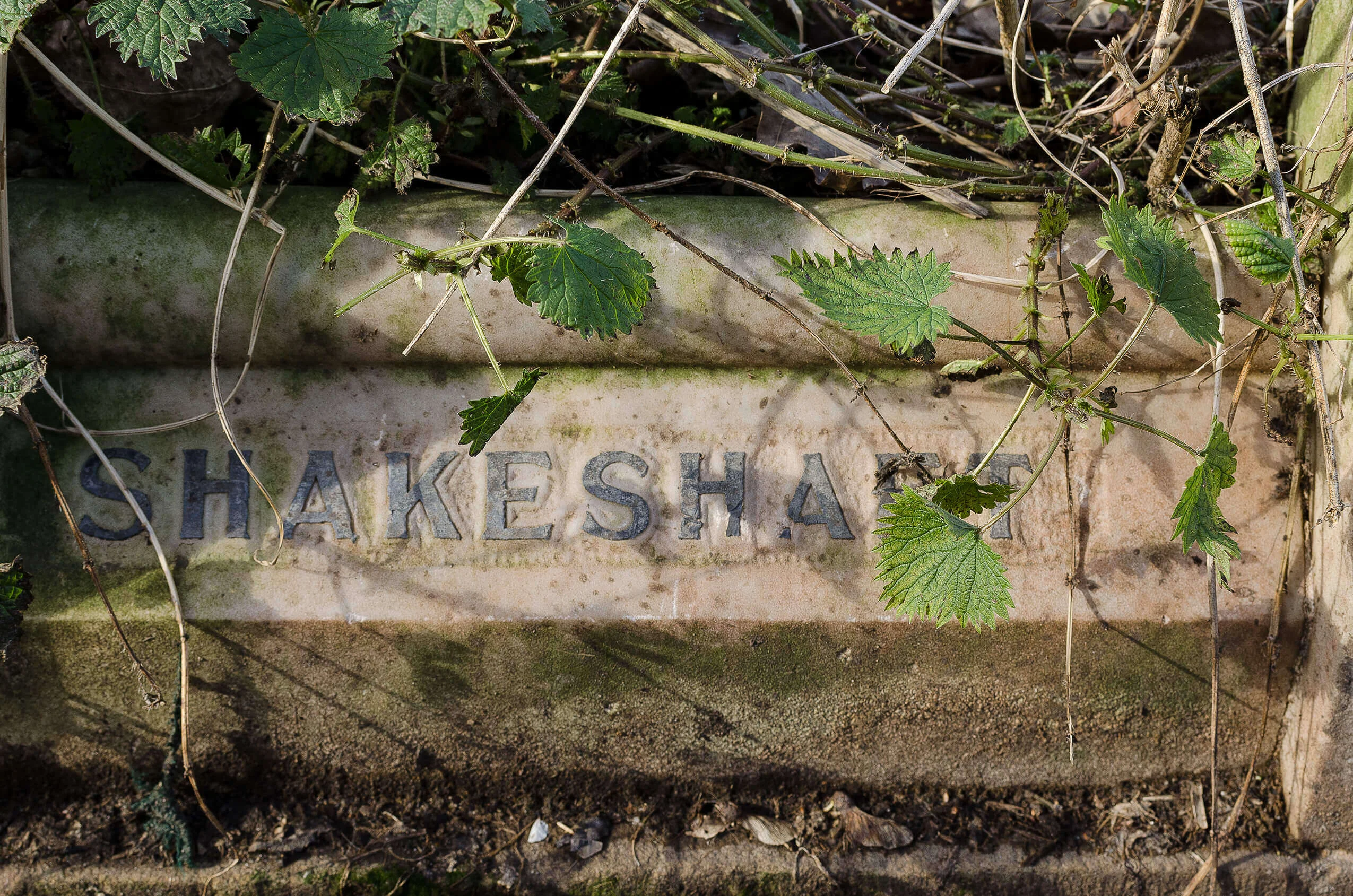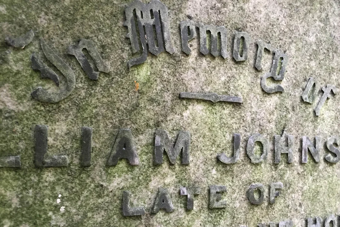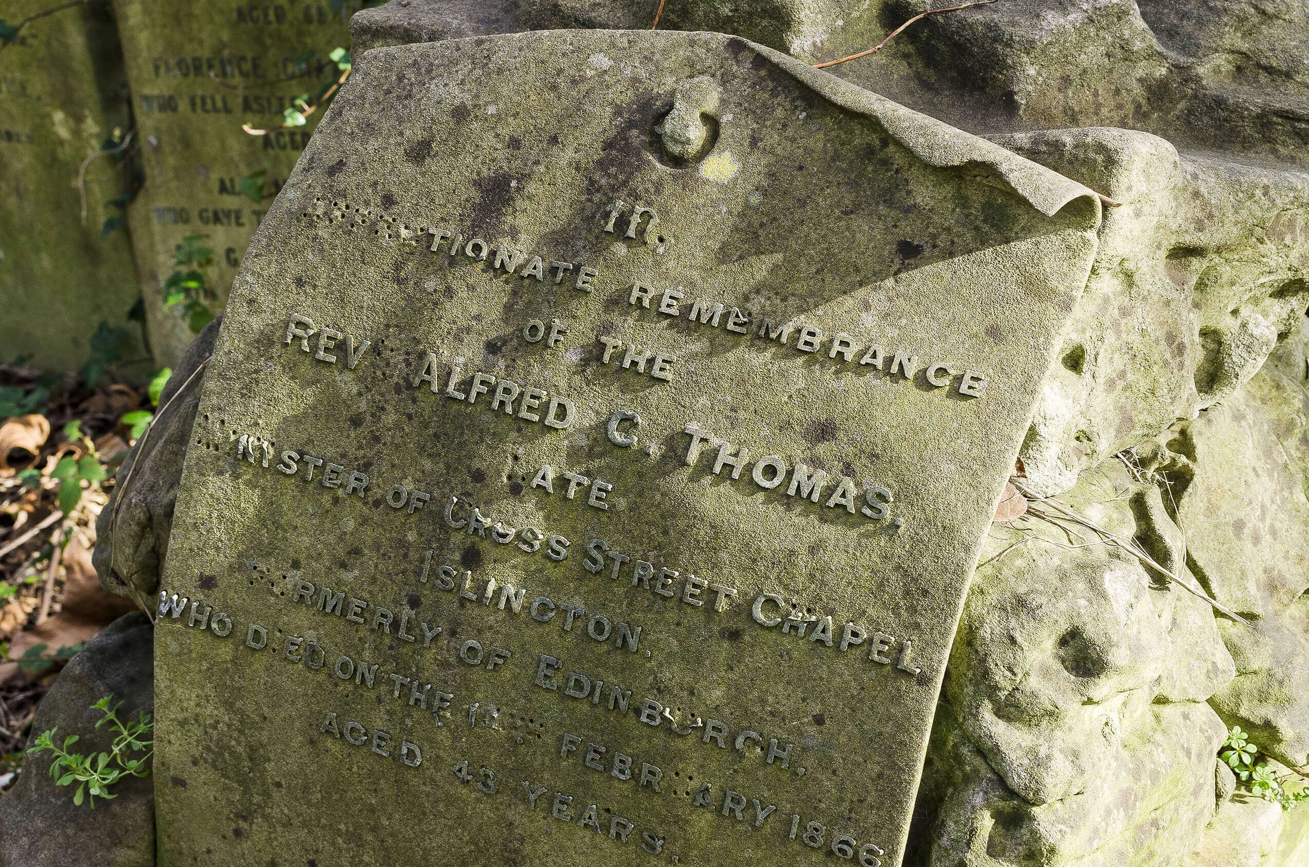 At Ramshorn Graveyard in Glasgow, an inverse phenomenon can be observed. Here, gravestones laid flat into the ground develop a distinctive typographic effect over time, as moss colonises the recessed lettering.