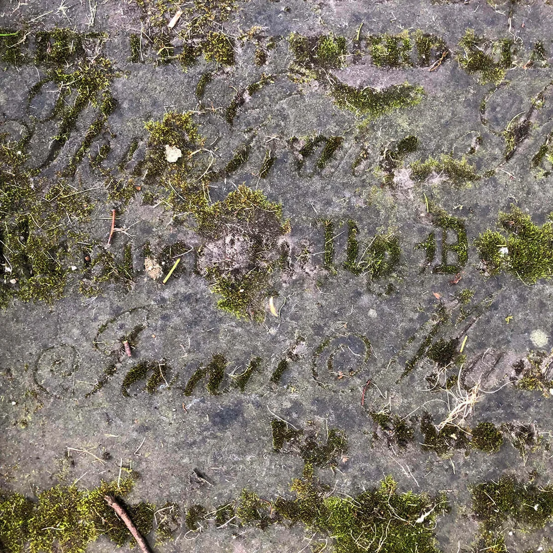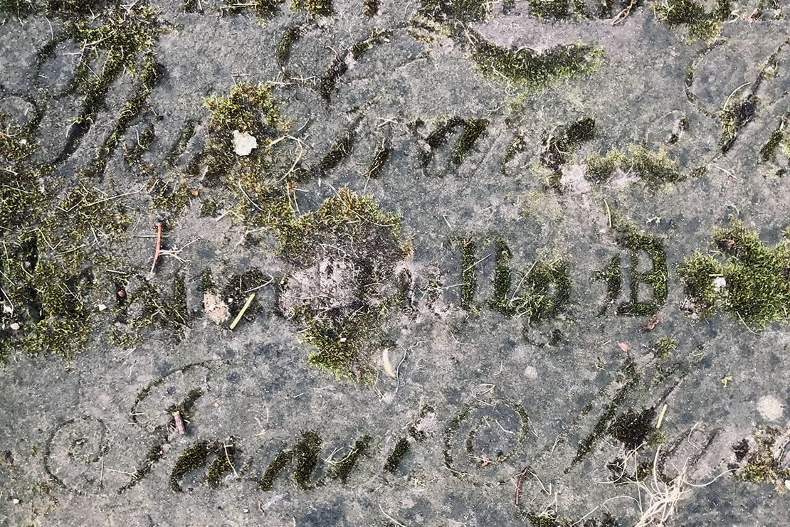 Rather than emerging from the surface, the inscriptions are gradually defined by organic growth: the moss settles within the engraved forms, rendering the letterforms visible through contrast and texture. The result is a subtle, time-shaped typography in which nature itself becomes the agent of inscription.